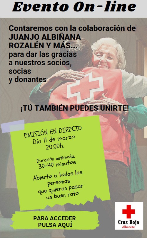 Cruz Roja de Caudete ha informado de que desde Albacete se ha preparado un evento online en el que participarán el mago Francis Zafrilla, el humorista Juanjo Albiñana, la cantante Rozalén, el actor Juanma Cifuentes o el modista Lorenzo Caprile, para dar las gracias a sus socios y donantes.