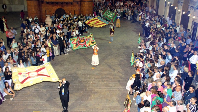 Hay varios elementos comunes con otras Fiestas de «Moros y Cristianos» del Levante español: la típica Entrada, majestuoso desfile de varias horas de duración, donde se lucen las Escuadras con sus mejores galas; la Ofrenda de Flores, donde los festeros hacen su ofrenda a la patrona, la Virgen de Gracia (en cuyo honor se celebran las Fiestas) o algunos actos pirotécnicos, como «mascletás» y fuegos artificiales. Pero también tenemos muchas cosas que nos diferencian y que nos hacen ser originales: el Ruedo de Banderas, acto único que se mostró en la Expo de Sevilla; una espectacular procesión de la patrona, precedida por cientos de festeros disparando trabucos, espingardas y arcabuces; figuras entrañables como la del Volante, niños de corta edad que ejecutan «la Rueda», emocionante ritual, delante de la Virgen y de los Capitanes, y tantos otros actos. Uno de estos actos, como ya se ha dicho, es el Ruedo de Banderas. La figura del Abanderado es una de las mas apreciadas por los festeros que «hacen la Fiesta». «Hacer la Fiesta» significa que cada año una familia de cada Comparsa se hará responsable de representar los cargos de Volante, Capitán y Abanderado o Portaestandarte (la Comparsa de Mirenos no cuenta con Bandera, sino con Estandarte). En este acto, el Abanderado «rueda» su Bandera en diversas posiciones (de pie, arrodillado, con una o dos manos) y durante un número determinado de vueltas, que puede ser de 90 o 180 (si es delante de la Virgen).