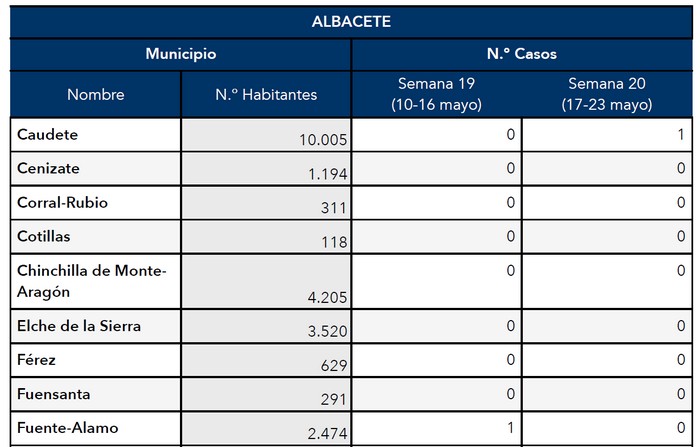 La Consejería de Sanidad ha notificado un positivo en Caudete por coronavirus durante la semana pasada.